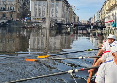 Rudern ist ein Sport für alle. Auch das wurde beim Flaggentag wieder deutlich. Die stellvertretende LRV-Vorsitzende Gabriela Brahmzeichnete zahlreiche Wanderruderinnen und –Ruderer für ihre bemerkenswerten Kilometer-Leistungen aus. Sie überreichte u. a. den 3. Äquatorpreis an Uwe Dünze. Er rudert seit 1971 und ist insgesamt schon über 120.000 km gerudert – dreimal um den Äquator. Moderator Julian Weiß fragte, wie viele Kilometer er in der Woche rudert: „150 bis 200 Kilometer.“